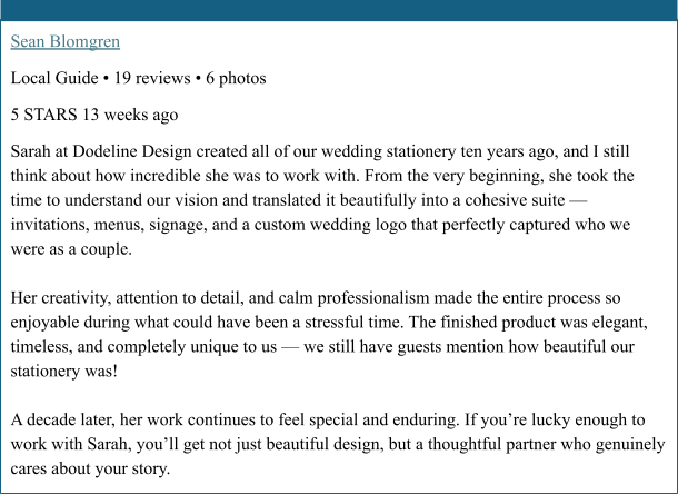 And as a matter of fact, this sweet couple took time out of their day to write us a lovely review TEN YEARS LATER!