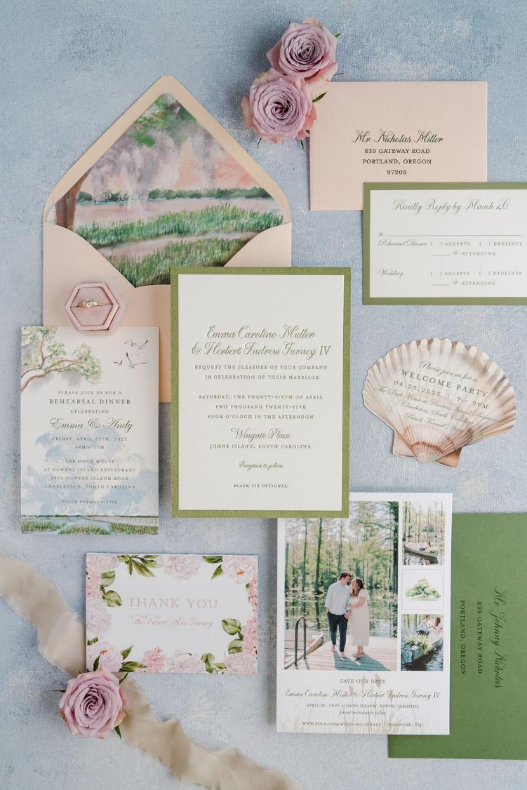 Of course, here at Dodeline we’re lucky to be in the charming, historic city of Charleston, SC, surrounded by both natural and architectural beauty. So celebrating the wedding destination is kind of our specialty! Below is a great example of one of our recent wedding invitation suites, leaning into the sunset marsh and oak trees surrounding the couple’s wedding venue, Wingate Place.