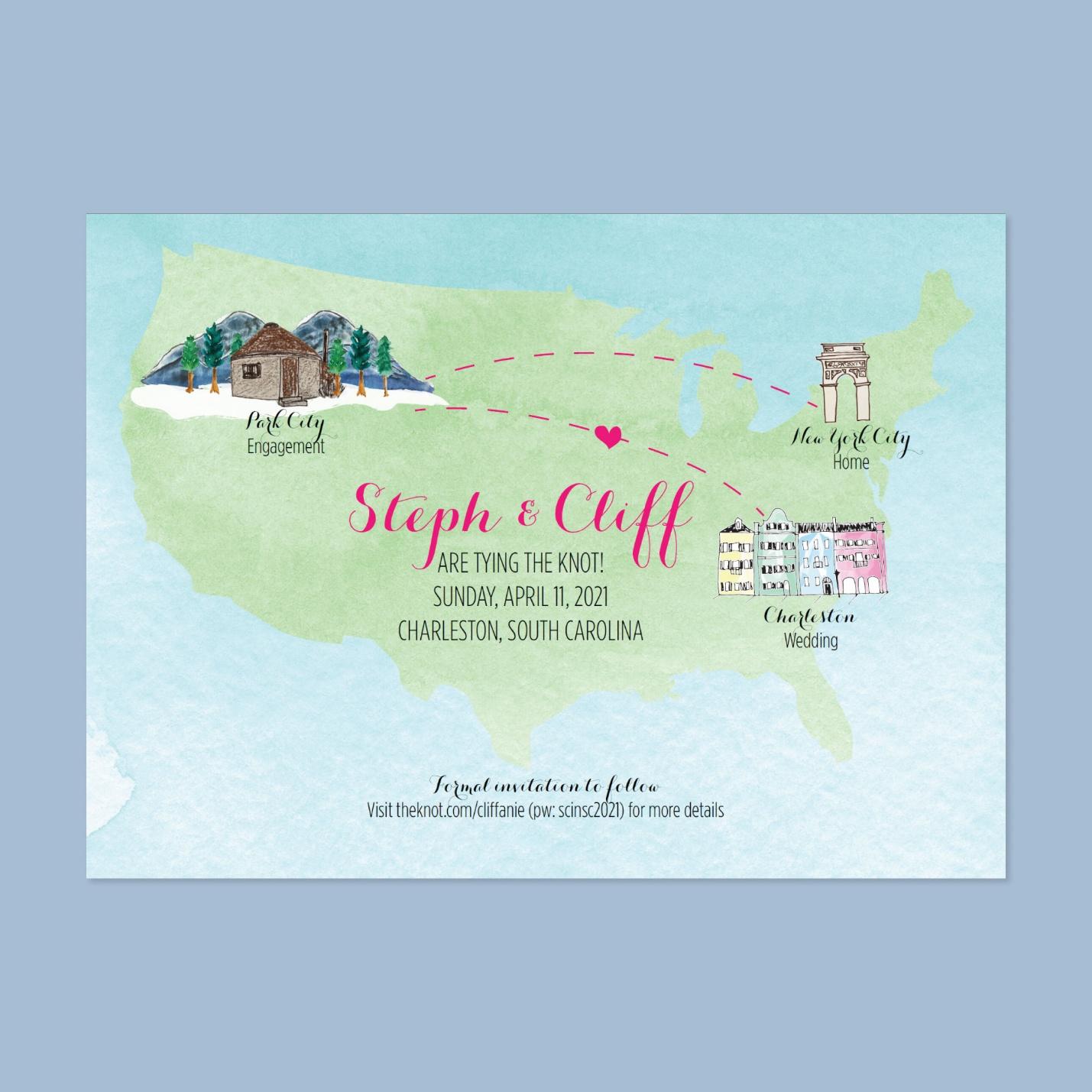 Another way to share that information is in a map format, like the watercolor wedding save the date card below:
