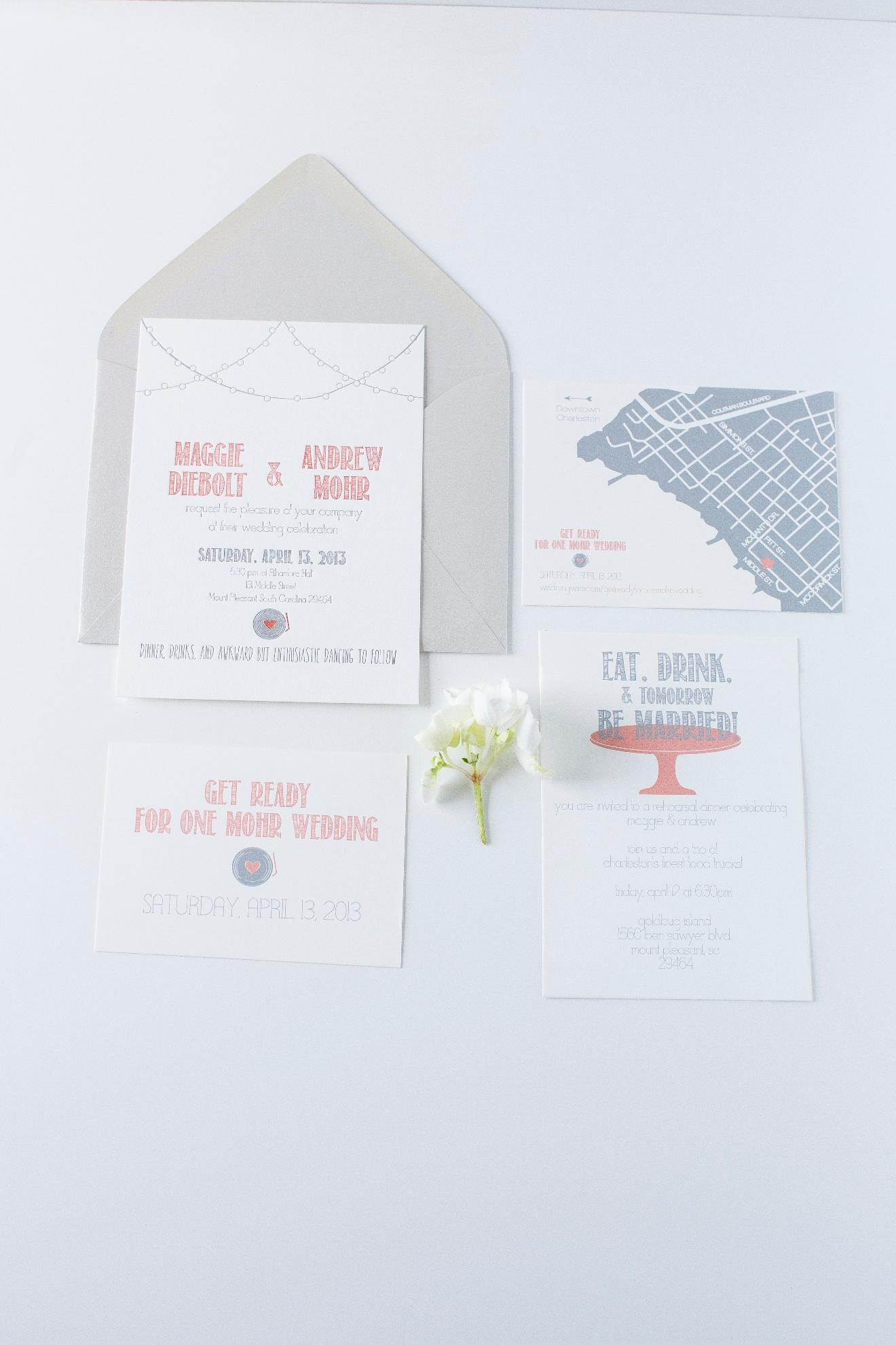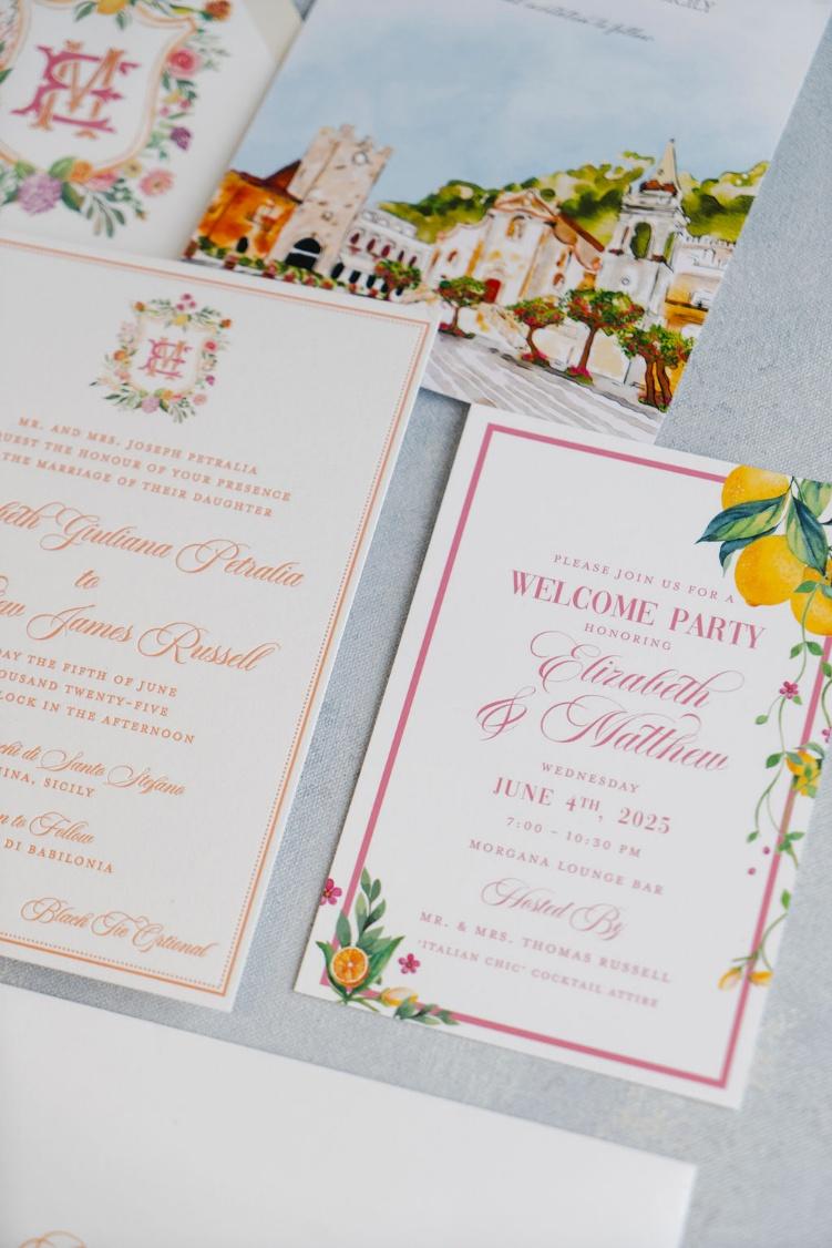 However, there are many incredible places to wed outside of Charleston too! For this suite, we drew inspiration from an Italian summer, drawing the beautiful Italian courtyard near the wedding venue and also creating a fully custom wedding crest. Chock full of personalized wedding ideas!