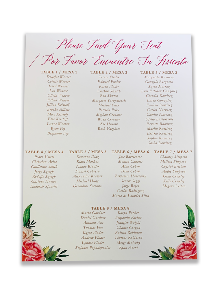 Large seating chart signs are a great way to get everyone to his or her seat. At Dodeline, we have made hundreds of them and are happy to help you with yours! A few details: